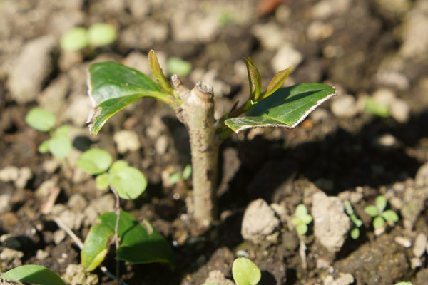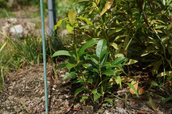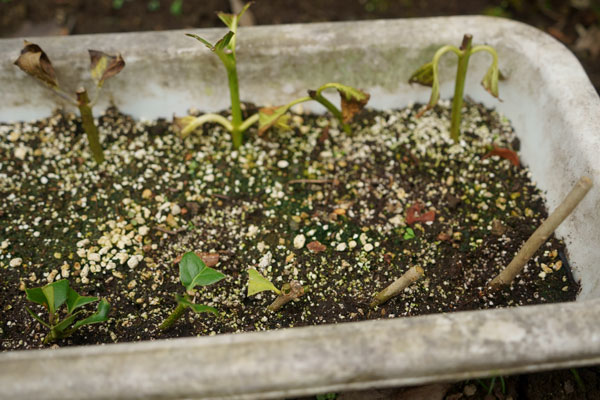 しかし、成功率が低いとされるキンモクセイの挿し木から根が出ていたので地植えした。この内、右の挿し木は後日所定の場所に移植したが鹿に食べられてしまいました。